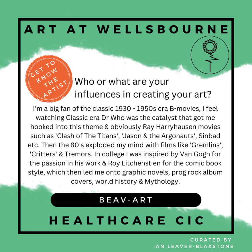 Beware!! Giant crabs, Enormous Robots, Japanese folklore creatures (Yokai) & many more monsterous beings, have taken over the downstairs waiting room here at Wellsbourne. These are the creations of our resident artist ‘Ian Leaver-Blaxstone’ (aka Beav-Art).