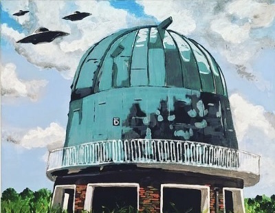 After appearing on Landscape Artist of the Year in 2019, I went back to Herstmonceux to paint the observatory. This painting is of one of the observatory stations being observed by some UFO’s. This painting was painted on a much smaller scale than my usual B-movie/Folklore canvases and have yet to decide what to do with it. I enjoy the colours and love its charming nature of this landscape, which is only enhanced for me with the unidentified flying objects above.