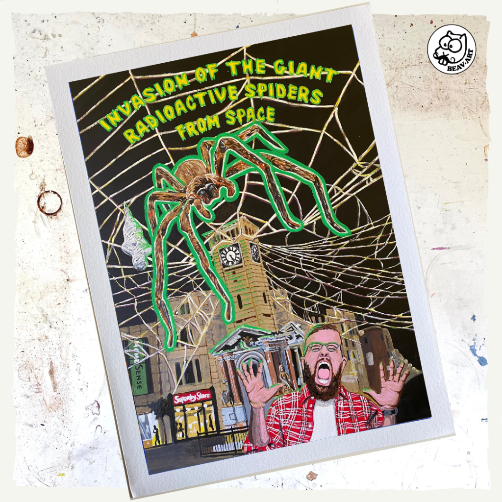 This painting is a science fiction nightmare. The iconic Brighton Clock Tower, stands as the epicentre of chaos and terror. Perched atop the tower, a colossal spider, grotesquely muted and menacing, looms over the city, striking fear into whoever is out on this mysterious night. Arachnophobes beware, this extra-terrestrial beast empathises the impending doom of humanity. Brighton’s once-bustling streets are now deserted, the radioactive neon spiders casting an otherworldly glow, capturing the palpable tension of an impending invasion, reminiscent of a classic B-movie sci-fi thriller.