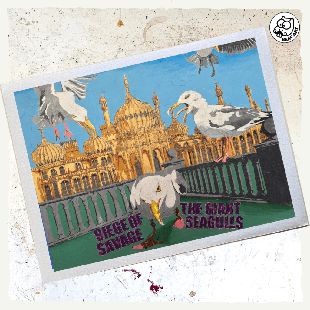 This painting captures the historical King George IV’s Royal Pavilion swarmed by giant savage seagulls. Ready to make this place their new hunting ground and it looks like you’re on the menu.
