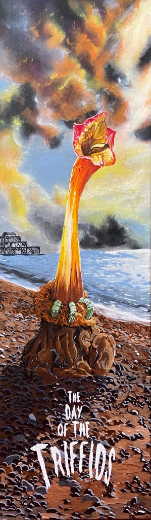 I painted this canvas after reading the book by John Wyndham. In the story they escape London and head down to East Sussex, but the triffids had already ventured across the Downs of Sussex. I thought the Triffids on Brighton & Hove beach would make an interesting picture with a burning sky and the old burnt out West Pier in the background, with the 1980s mini series variation of the Triffids roaming the beach in search of its next victim.