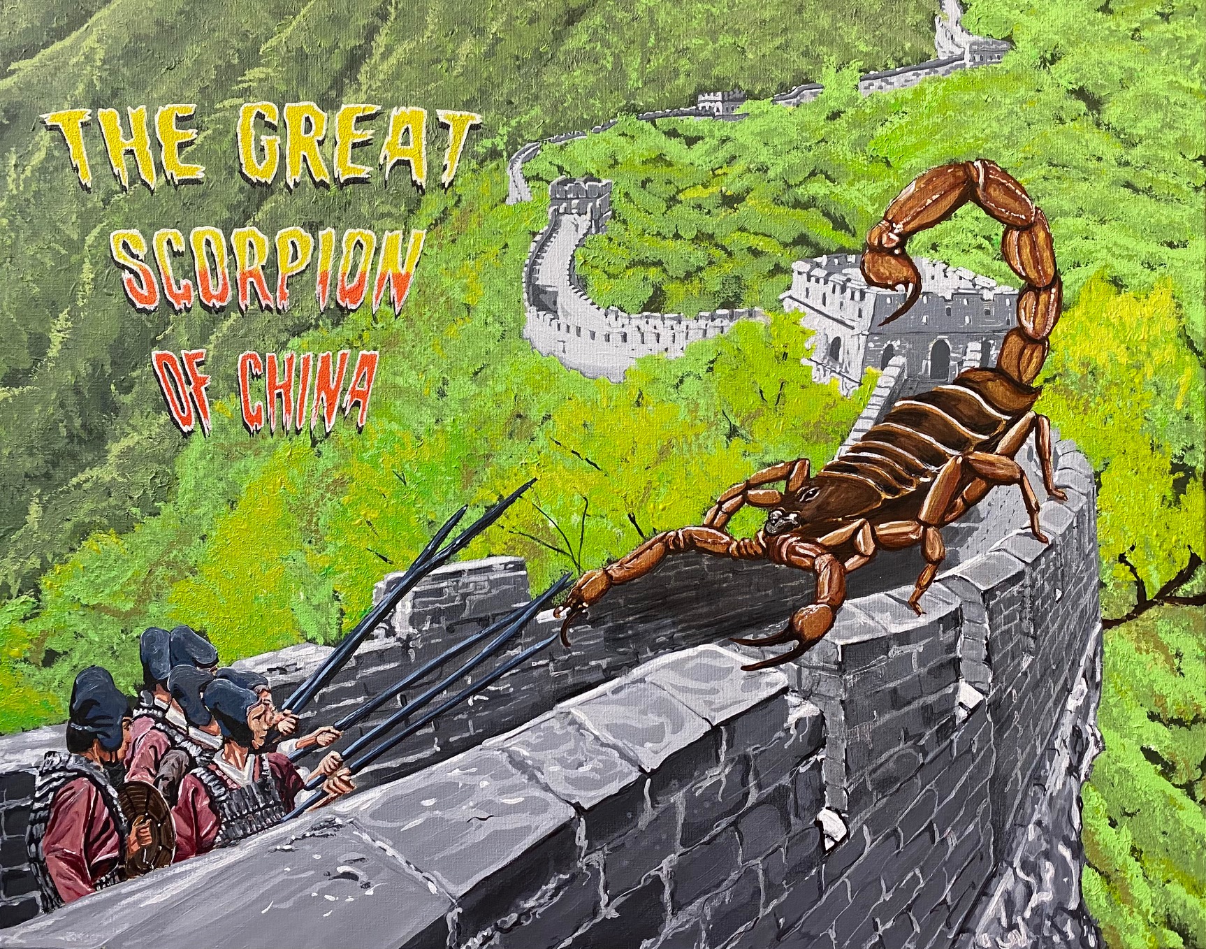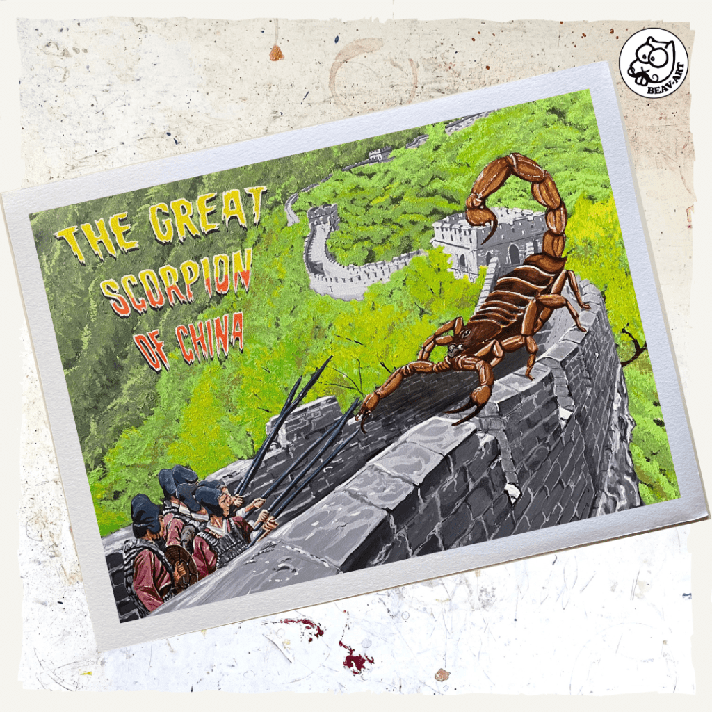 The army wearing their lamellar armour, usually are defending the wall from Genghis Khan & his Mongolian army. But in their surprised and worried state, are defending the wall this time from a great big ‘Oliverus Martensii’ also known as the ‘Chinese armour-tail scorpion’.