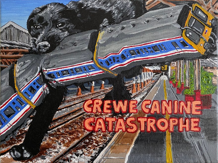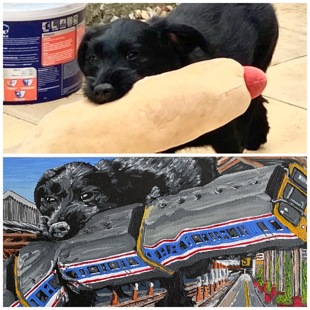 At the time of painting this picture my clients puppy called ‘Bear’ was only 10 weeks old. They wanted their puppy to terrorise Crewe and we came to the conclusion that Crewe was famous for its history linked to the railway. So it only seemed right to have ‘Bear’ cause havoc through Crewe’s Railway station.