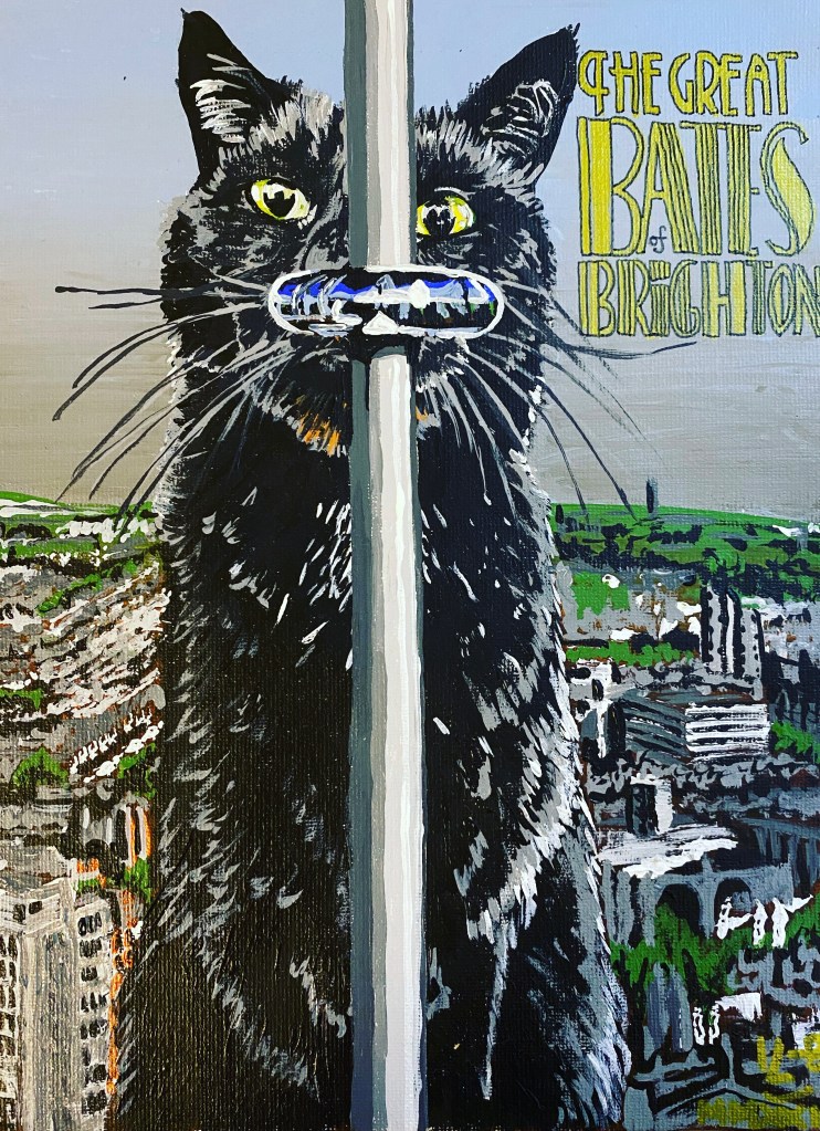 My client wanted their cat painted in an old school 1950s style sci-fi way, like ‘Attack of the 50ft Woman’. They were also really into the old Godzilla classic films, so making their cat Bates a giant was definitely the way to go with this painting. As Bates was going to be big, I felt it only fitting to have a title that suited like the Great Gatsby. Which is how I came about with the title ‘The Great Bates Of Brighton’. This painting along with all my commissioned B-Movie Pet Portraits, was painted on an A4 sized canvas.