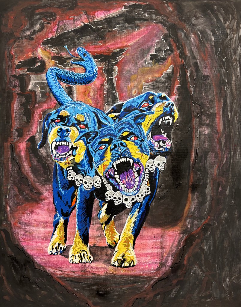 Cerberus is a three-headed dog in Greek mythology. His role is to guard the gates of Hades and allow dead people in but no one out. He was not allowed to admit any living people into Hell; as a flesh-eating monster, he was supposed to eat anyone who tried to get in.