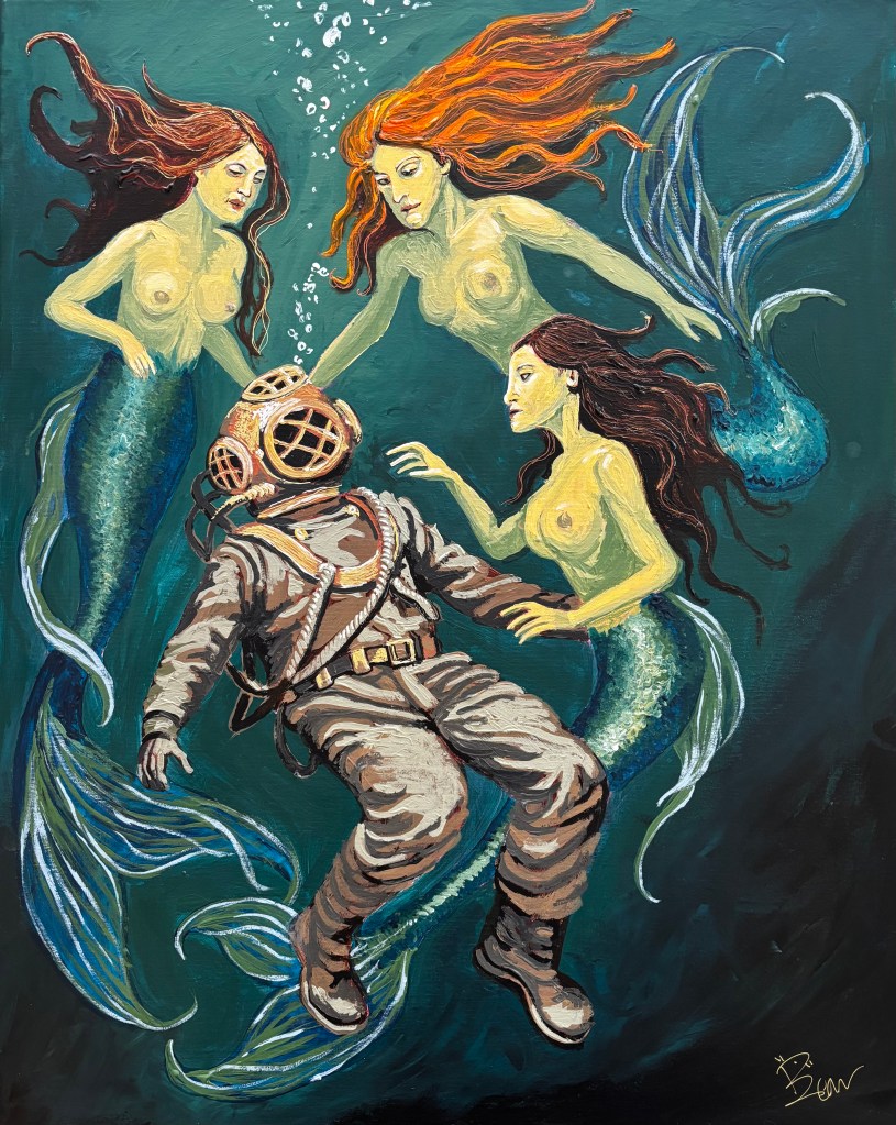 …depicts a diver in a vintage scuba suit, suspended between breath and surrender, as water slowly claims him. Three mermaids encircle his descent—at once witnesses, muses, and embodiments of an unattainable love—offering beauty without rescue. The painting lingers on devotion so profound it becomes fatal, where love is not salvation, but the depth into which one willingly sinks.