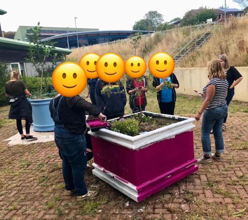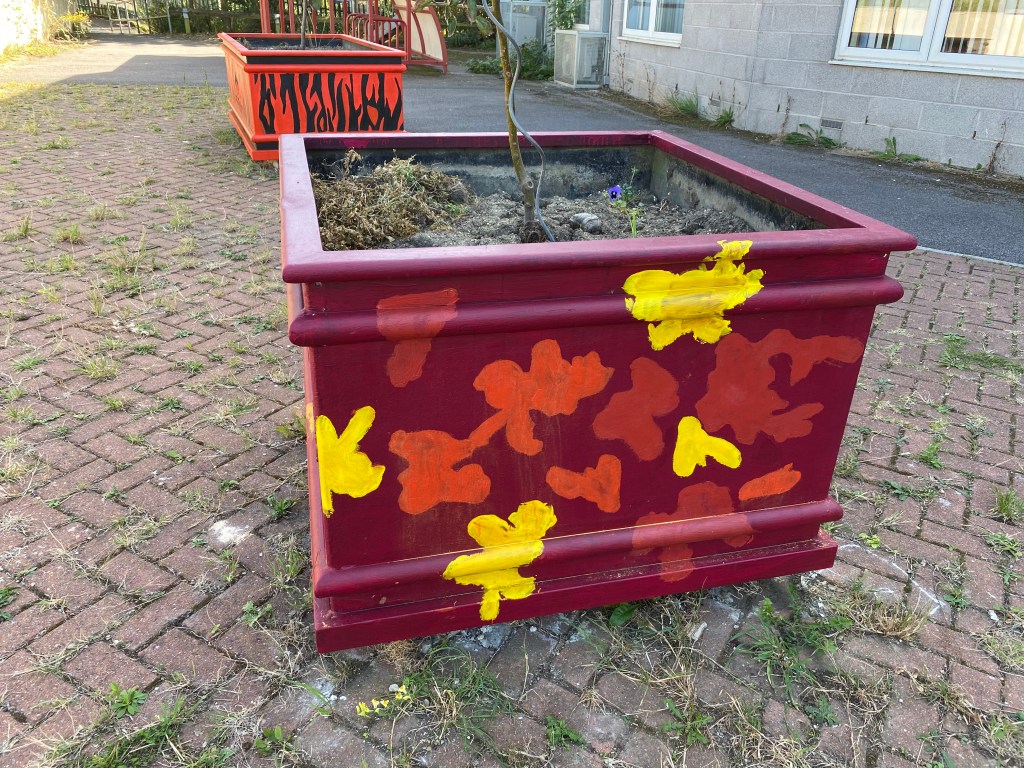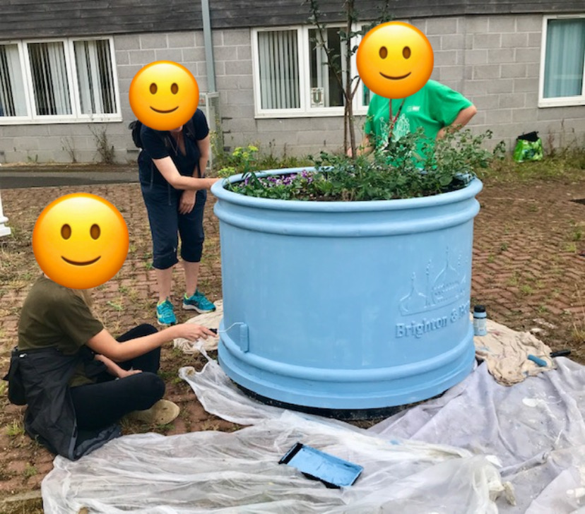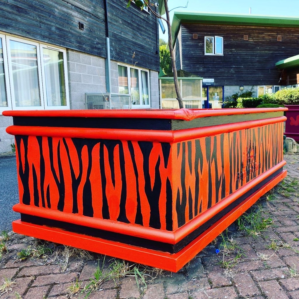 I held a two day workshop over East Brighton in association with Wellsbourne Healthcare CIC, The Trust For Developing Communities, East Brighton Trust & Sussex Community Foundation. These workshops were aimed at 11-18 year olds living in East Brighton, to learn the skill of wall stencilling. We painted 3 different sized planters up. The blue planter was 1980’s design inspired, hand painted blue, then stencilled and finger painted splats. The Purple planter was created by young people from the workshop, which was camouflage inspired. Lastly the orange planter was also thought up by the young people on the workshop, who decided on tiger markings. Hand painted in orange and then stencilled black tiger print. These were all done in acrylic paint and then spray varnished when completed.