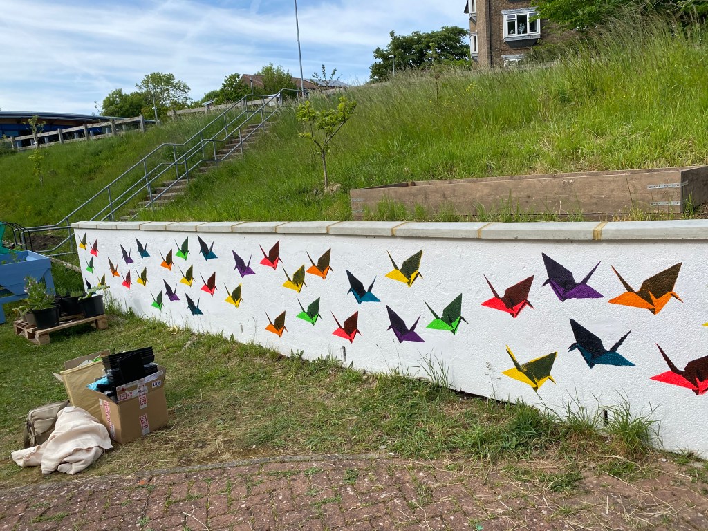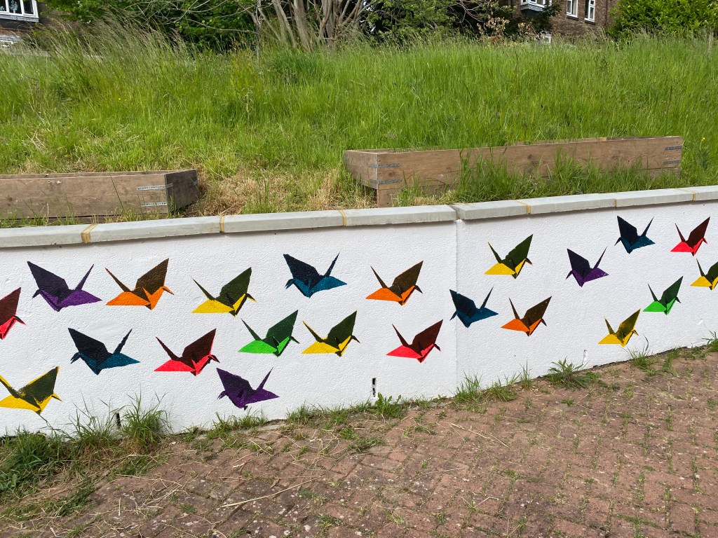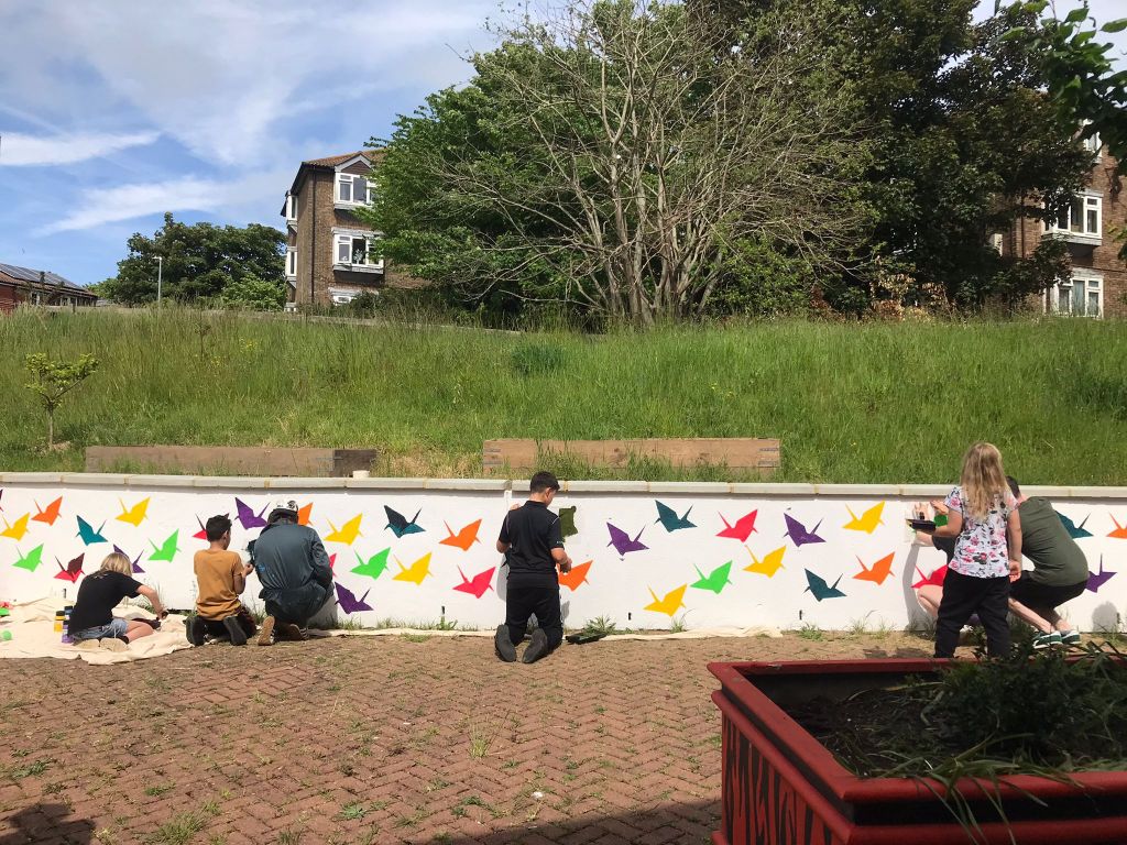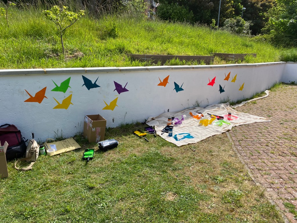 This was a community mural workshop I ran for young people of East Brighton to learn how to stencil using rollers and acrylic paint. This took place on a gloriously sunny day in the Wellsbourne Healthcare CIC community garden. I chose to use the stencils of origami cranes to mark a years anniversary of the ‘Souls to paradise’ covid mural back in 2021.