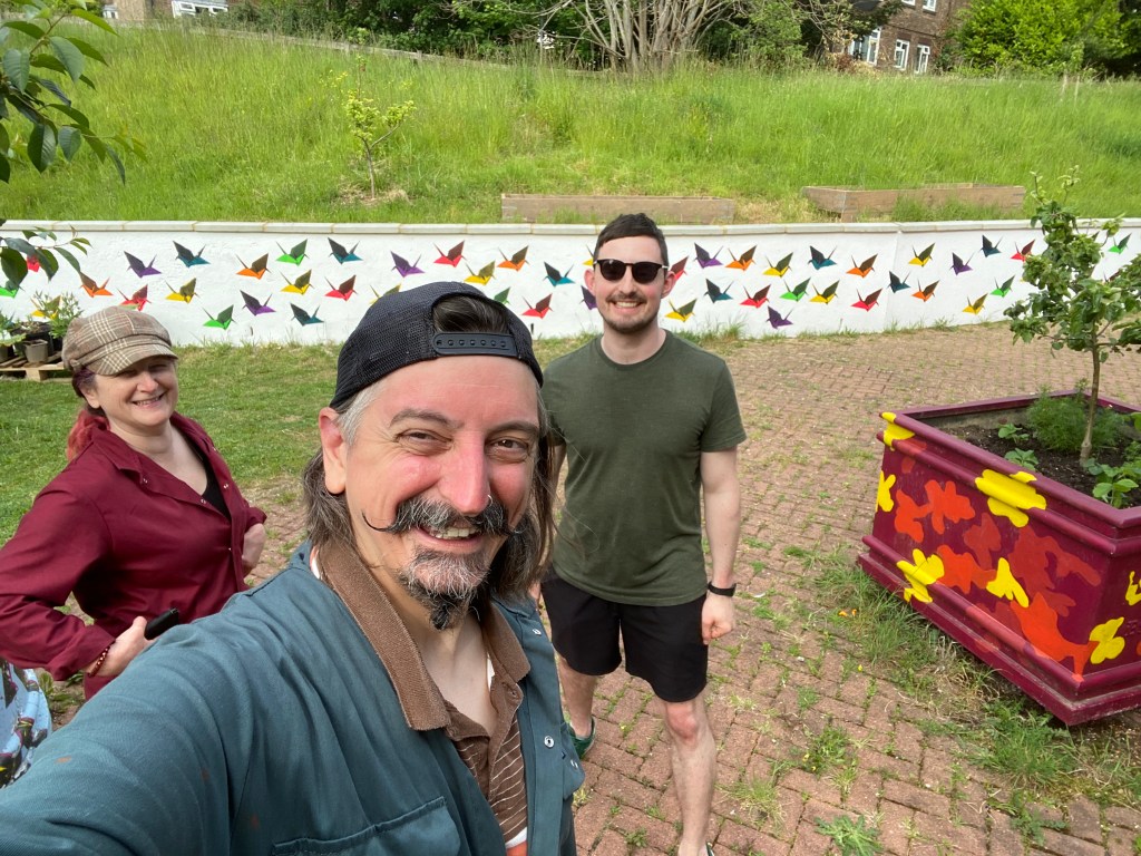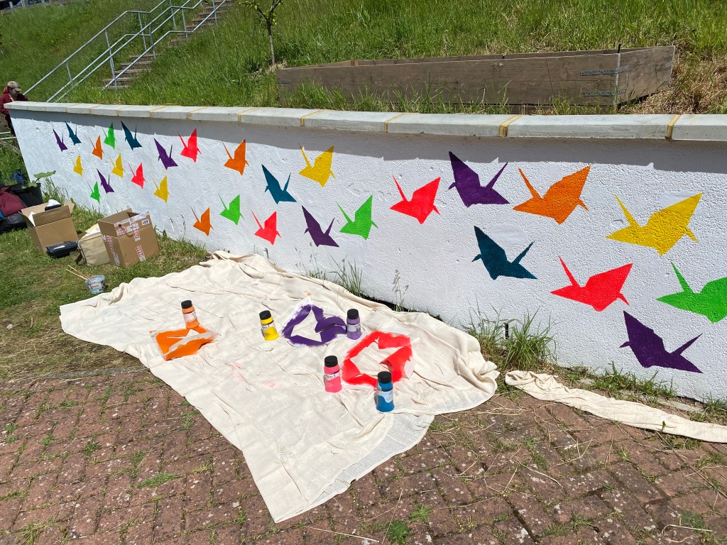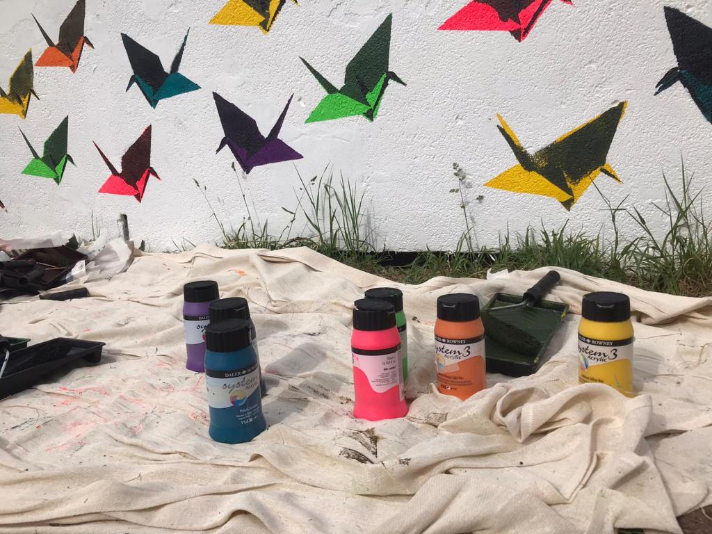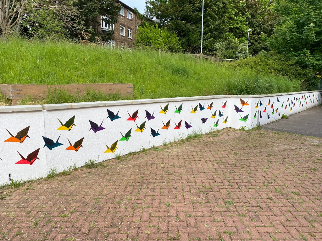 This was a community mural workshop I ran for young people of East Brighton to learn how to stencil using rollers and acrylic paint. This took place on a gloriously sunny day in the Wellsbourne Healthcare CIC community garden. I chose to use the stencils of origami cranes to mark a years anniversary of the ‘Souls to paradise’ covid mural back in 2021.