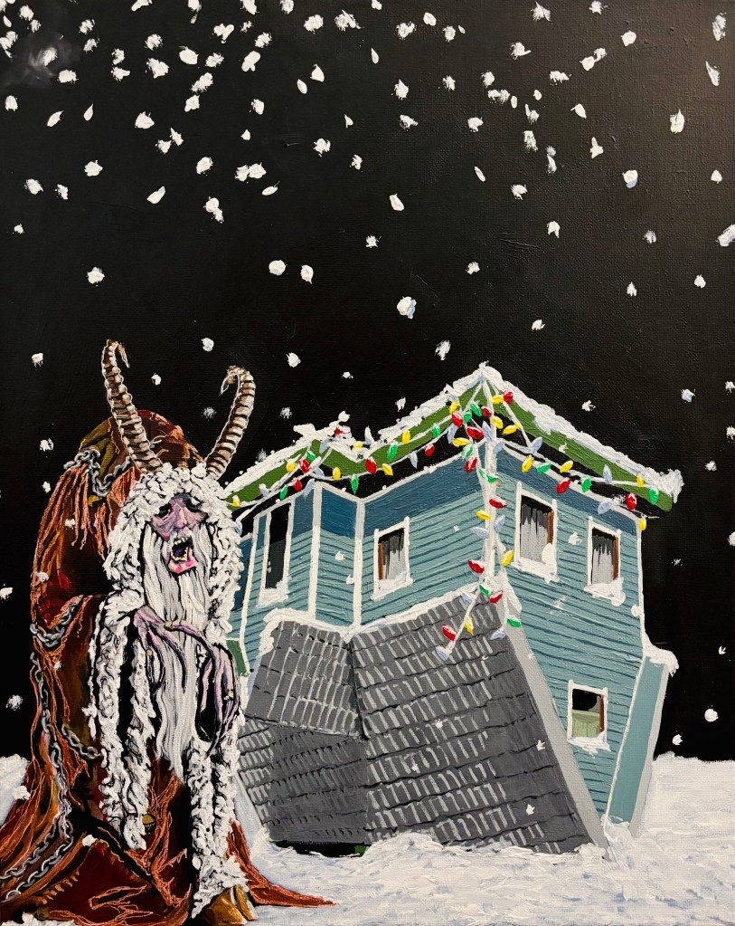 Krampus is a horned anthropomorphic figure who, is said to accompany Saint Nicholas on visits to children during the night of December 5th ‘Krampus Night’, immediately before the ‘Feast of St. Nicholas on December 6th.